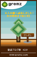 環境の事を身近に感じさせてくれてgremzには感謝です。 で、次はけちゃっぷさんの木がどんな木に育つか楽しみっすね~ ![]() た、、たぶん・・・わたしの育ててる木よりも先に、よしくんの次の木が大人になるような・・・そんな予感がします(^ー^;;;;;) ←あ、汗で顔が膨張してる!