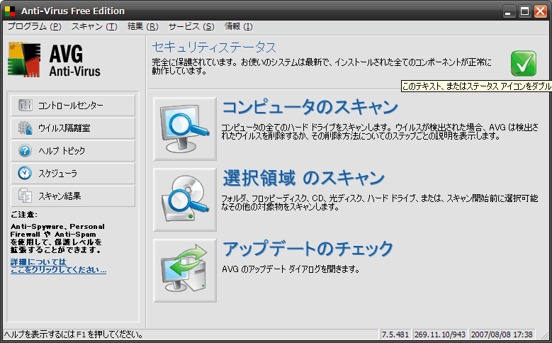 アンチウィルスソフトをまた変えました。 以前はノートンを使ってましたが 激重なのと更新料の高さに負けてAOL提供フリーウエアのAntiVirusShadeに変更。 ところがAOLのAVSの提供が突然終わったのでAOLのMcAfeeに。 McAfeeはファイアーウォールも付いてるセキュリティーソフトだけど かなり重いんです。 常駐メモリ使用量219MB プロセス数19これじゃねぇ・・・ なのでavast!に変更。 でもavast!も意外にもっさりだしウチの環境だと起動遅い。 だから昨日リリースされたばかりのAVG日本版に変えました。 使った感想は軽い! サクサクしてます! ウチの環境だと起動も速いしなかなかイイ! なにより日本語表記なのでいざと言う時慌てなくていいかも。 ただし現在、ダウンロードが殺到しているのかAVG JAPANのHPが非常に繋がりにくい状態です。 ダウンロードは→ココ |