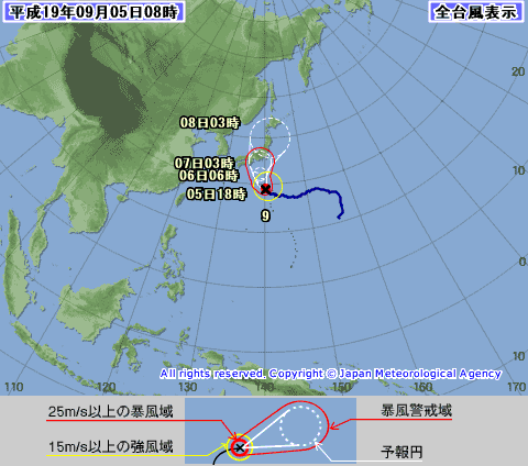 台風9号FITOW(フィートウ) が関東地方直撃コースを進んでいるみたい。最大風速が中心付近で30m/sらしいのでそれほど強くはないけど 予想進路に近い方、特に台風の東側の方は要注意ですね! 気象庁台風情報 を随時確認しましょーっ!それにしても宮崎は晴れてるけど蒸し暑い ![]() 上の画像はPINだから見られないケータイがあるかも? ケータイ向けには変換するのかなぁ?サイズだけかなぁ? 判りませんデス ![]() |