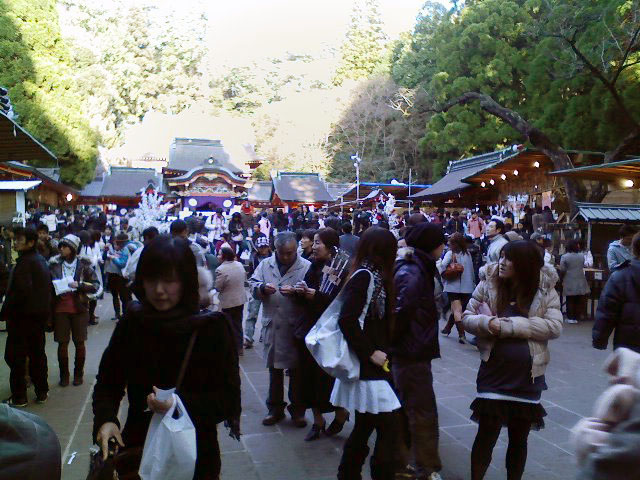 してたからで旅行へ行ってたわけじゃ~ありません ![]() 大晦日の夜はレッドホワイトナントカを見ながらだらだらお酒を飲んでました。 で、元旦はだらだら朝寝。。。起きたのは8時過ぎでとっくにお日様はニコニコ。 だらだらとお雑煮を食べてとしくんはだらだら実家へ帰って行きました ![]() ![]() としくんが実家にお泊まりだったので僕は家でエアコンと加湿器と甘露ちゃんとゴロゴロゴロ・・・ おっ!まだ初詣に行ってません。 なので昨日3日に三社参りをしました。 まず宮崎八幡宮。ココは神社がやってる保育園に僕が通ってました。 雉(キジ)とか孔雀とか鳩がいっぱい居たのにもう居ません ![]() 次は、宮崎の人間ならやっぱ外せない神武さん、宮崎神宮へ。 3日だから人出は少ないだろうと考えた僕らが甘かった。。。 駐車場は満車だし周辺は凄い渋滞だし。 なので、お隣の文化公園の駐車場へ駐車してお参りに。 しっかりお参りし、破魔矢とお守りを買い、 おみくじひいたらとしくんは吉!僕は大吉!! 僕は結構大吉をひきますが現実は・・・でも今年こそは!! 露店が気になるけど最終目的地の鹿児島県の霧島神宮へ ![]() ![]() 宮崎からだと普段なら1.5時間くらいかかります。 がっ! 大渋滞でした。動きません。車が・・・ 高原町経由で御池を過ぎた山の中から高千穂牧場過ぎて霧島神宮まで(多分4~5Km)ずーっと車列が 続いていてた~いへ~ん ![]() だけど、ウチの車の中は歌い放題、踊り放題なので退屈はしません。 霧島神宮からやたら遠い臨時駐車場に誘導されて無事駐車し、 ト◯レに走り込んだ後、やたら泥まみれなシャトルバスに乗せられて出発したものの、 ちょっと道路を走ったら急に左折。 なに? 中型バスのダート走行です。揺れますです 傾きますです 不安ですです![]() なんと臨時駐車場から神宮まで山に中に道路を造ったみたいです。 でも舗装もしてないし狭いし急カーブ連続だし高低差あるし薄暗いし・・・こんな所、バスが走っちゃイケナイと思いまーす! こんな所走るから泥まみれなんだと今更ピ~ンと来てもと思いながらもホッホ~と感心。 始めは何処かへ連れて行かれて何処かの宇宙人とかに食べられる んじゃないかと少し不安だったけど中型バスのダート走行なんてめったに経験出来ないのと思ったらなんだか楽しーっ ![]() で、喰われる事なく霧島神宮に到着。 いつもの霧島神宮とは違い大変な賑わい! え~っと新年早々デジカメを持ってくの忘れてケータイ撮り ![]() Photoshopで頑張りましたが元がどーしよーもないのでこれ以上無理。 ↑としくんは寒さで顔がカサカサ。僕は着ぶくれパンパン。 ちゃんとお参りを済ませて、さぁ~始まりました! やきいか、たこ焼き、ぜんざい、フライドポテト、クレープ。これ全部食べました ![]() どれも美味しくて霧島神宮は露店が大当たりです。 で、何が目的だったのかはハッキリさせずにまたシャトルバスでダート走行。 帰りのバスは暖房地獄 足下から熱風で炙られて宇宙人に ・・・薄暗くなった森の中では鹿が迷惑そうな顔して睨んでいましたが無事に臨時駐車場に到着。 そこからは来る時の大渋滞がウソのように車は減ってました。 「3日だから人出は少ないだろうから・・・」みんな考える事は同じみたい。 そう言えば・・・ 今日からとしくんはお仕事。仕事始めに主任が休みで???な職場へ元気に出勤して行きました。 あっ、今年もとし*よしをよろしくです ![]() |