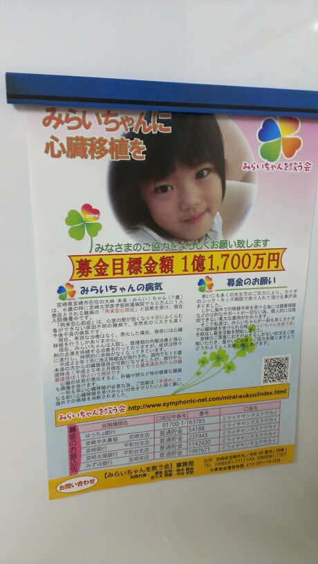 みらいちゃんは宮崎市在住の7才の女の子。 心臓移植をする為に資金を募っています。 ところが下記HPによると検査の結果、予想より進行が早いみたい… http://www.symphonic-net.com/mirai-sukuu/ 休憩室のホワイトボードにも何気にコッソリ貼ってきた(°°;) 剥がされたらまた張るつもり。。。 |