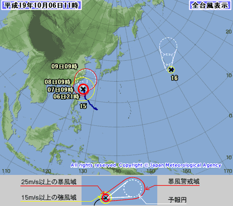 台風15号 KROSA(クローサ)は来るのかなぁ? 上陸はなさそうだけど、大型で猛烈に強いって事なのでチョット心配。 ©気象庁 宮崎は少し台風っぽい風がふいてるし、雨も時々降ってます。 リンク:気象庁台風情報 |